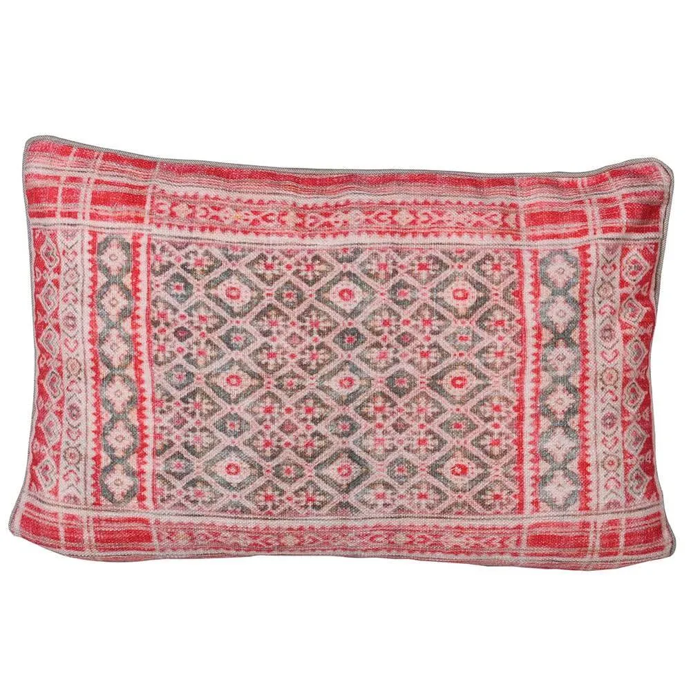 Pretty patterned oblong cushion in shades of red, pink and neutrals with piped edge. Perfect for adding a colour splash or accent to your space. Combines well with neutral and other textured cushions