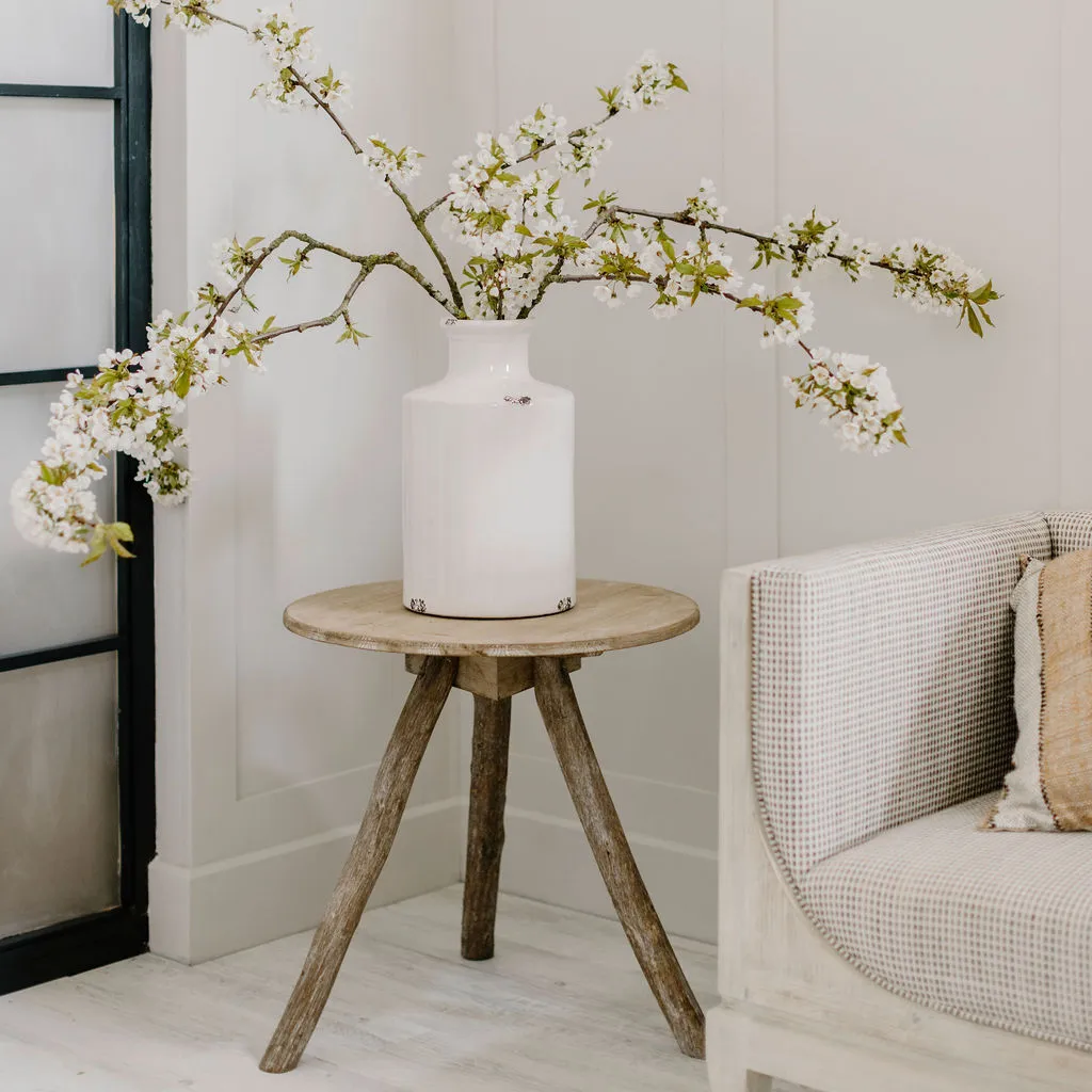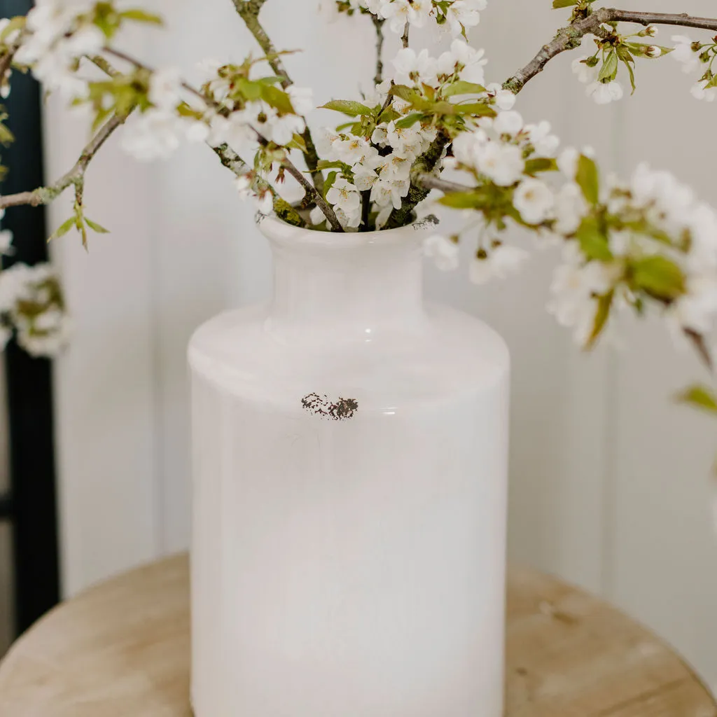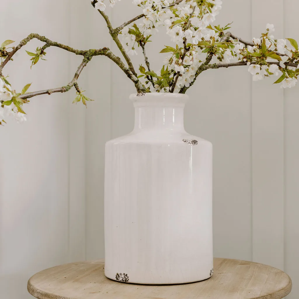 Another fantastically stylish piece used alone or with other white ceramics. Beautifully glazed with a distrssed finish to give it modern appeal, this statement vase has a shaped bottle neck making it look good on its own or with statement stems.
