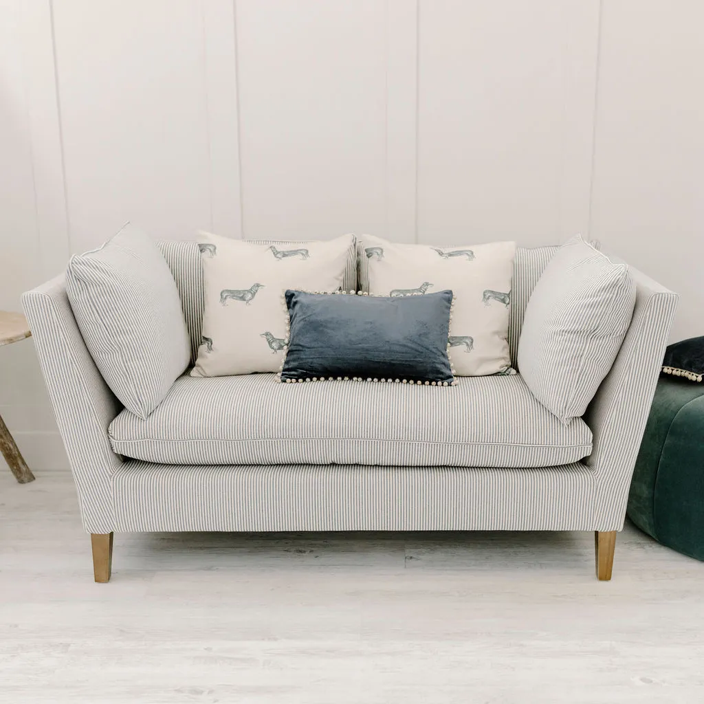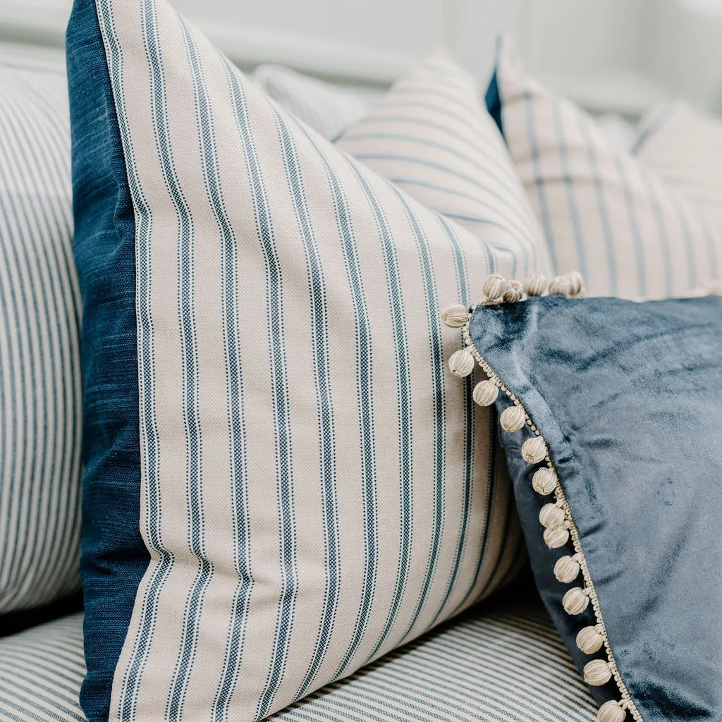 An elegant cushion in the softest of blues to add luxury and style to any scheme. Made from velvet with a soft taupe bauble fringe trim for a super chic look