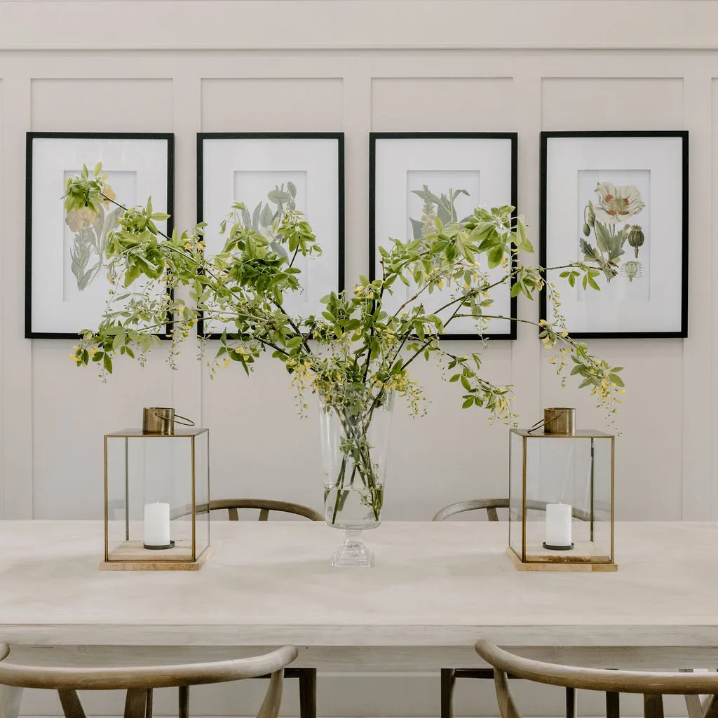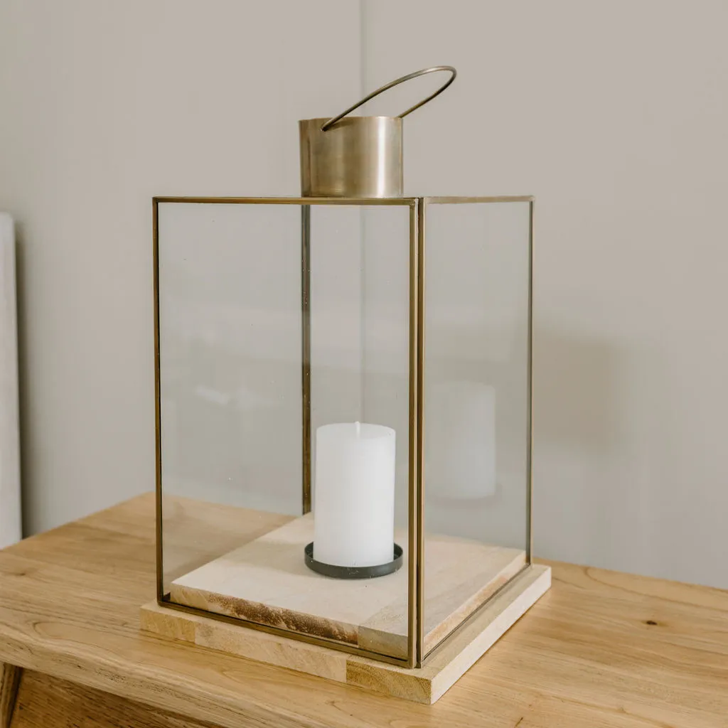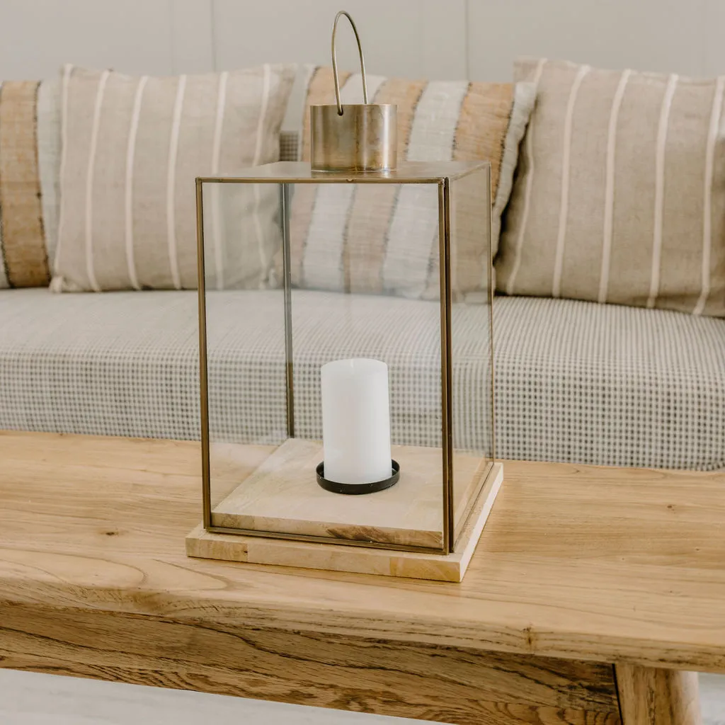 This stunning lantern is modern and refined, making it a hard working, versatile piece when used individually or in pairs or more! With its brushed gold yet restrained edges and mango wood base, it's the perfect compliment to natural wood furniture and tables.