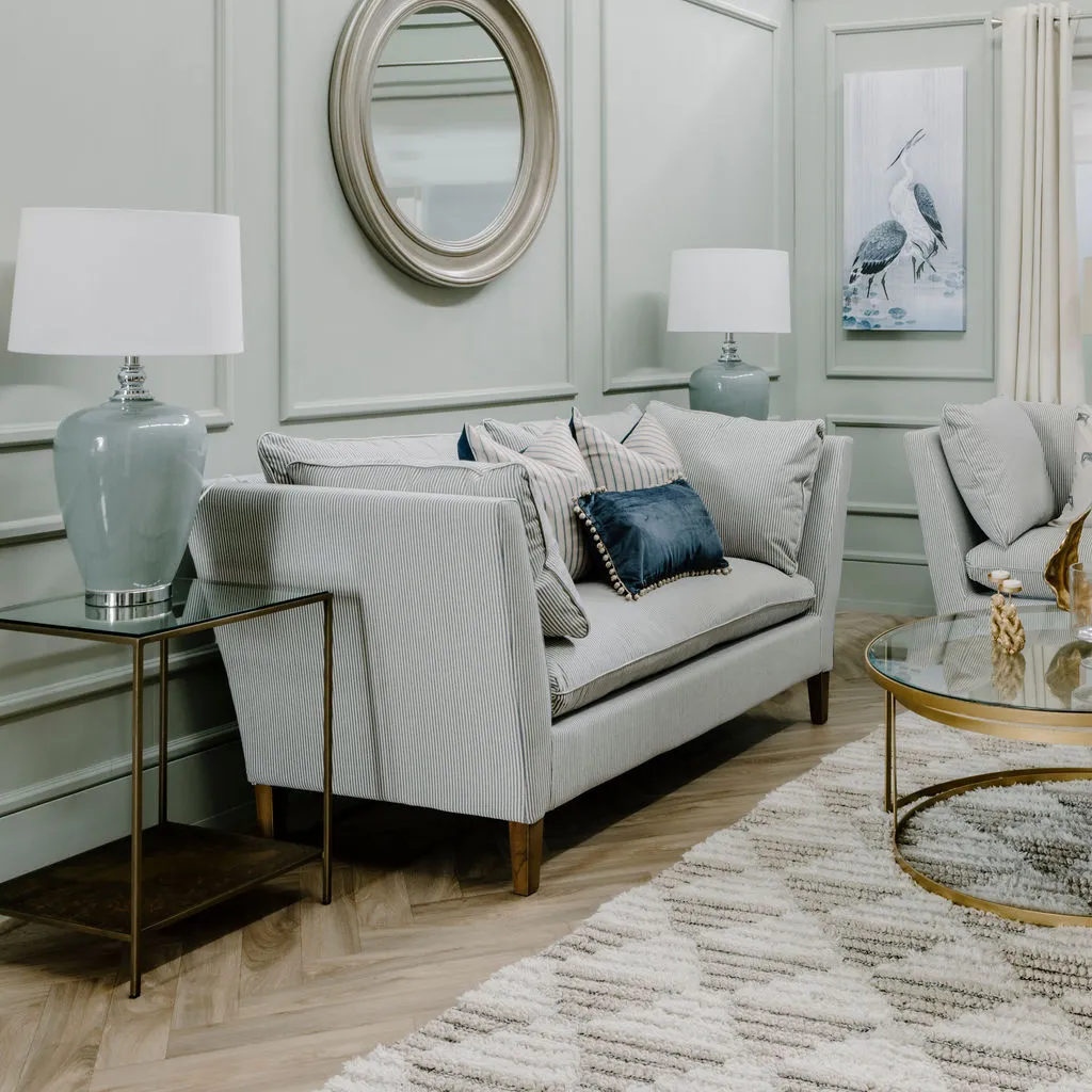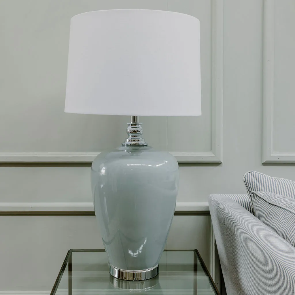 In a wonderfully soft scandi soft blue/grey, with neutral linen shade, this is a real statement lamp. Beautifully proportioned, with a gorgeous glaze, it looks stunning on a side table next to a sofa or used in pairs on a console or, well, anywhere really!