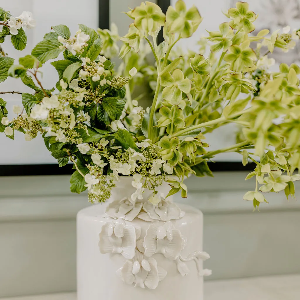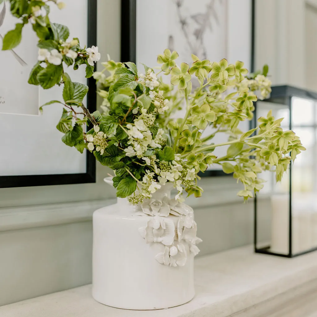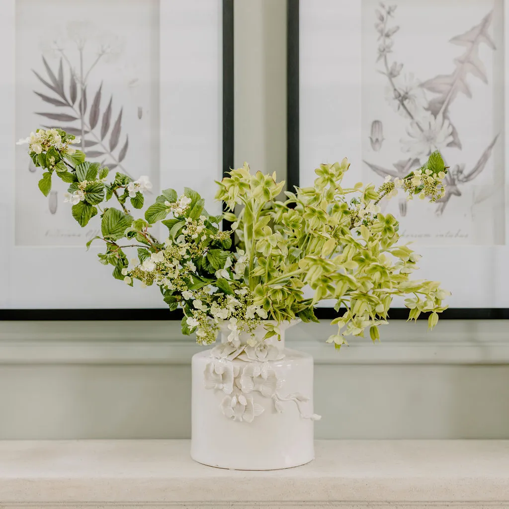 One of our most beautiful vases - the intricate 3-dimensional floral, cascading design is simply stunning. In pale cream, this vase looks incrtedible simply as a decorative piece or with garden flowers, stems or grasses - colour pops, greens or neutrals, you choose!