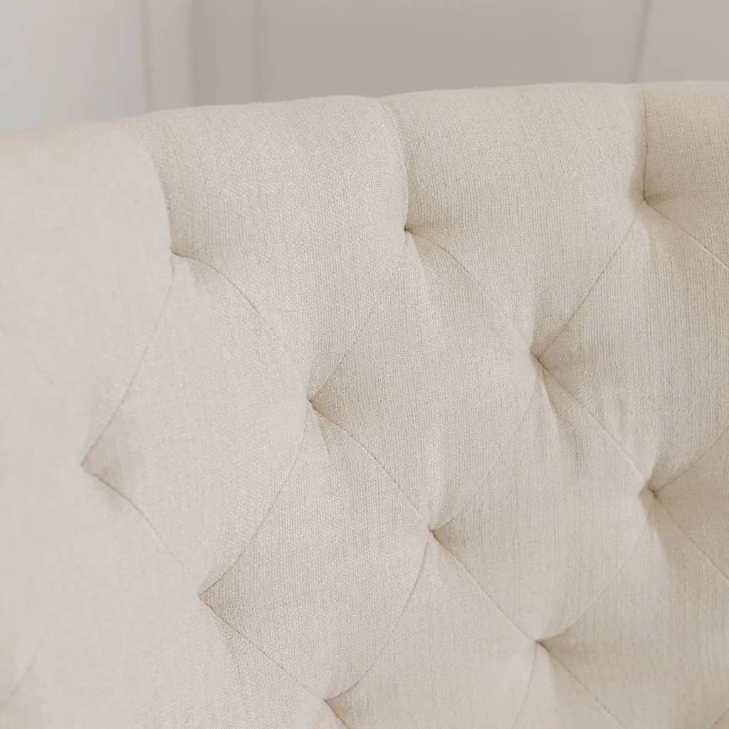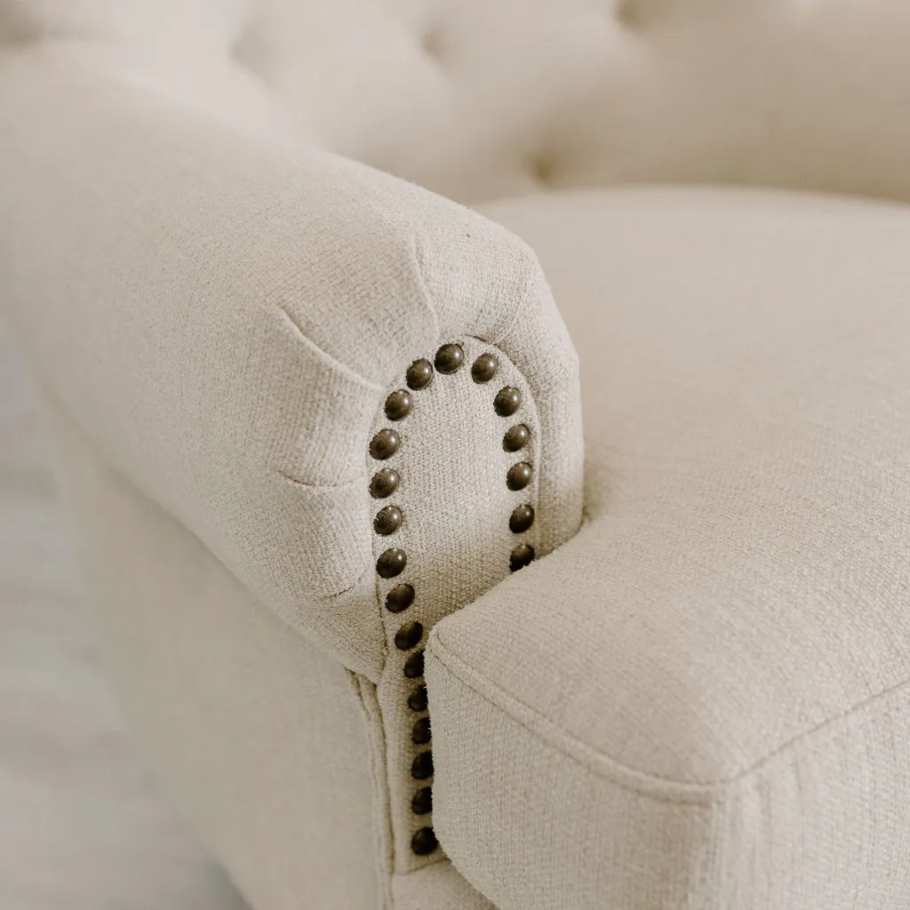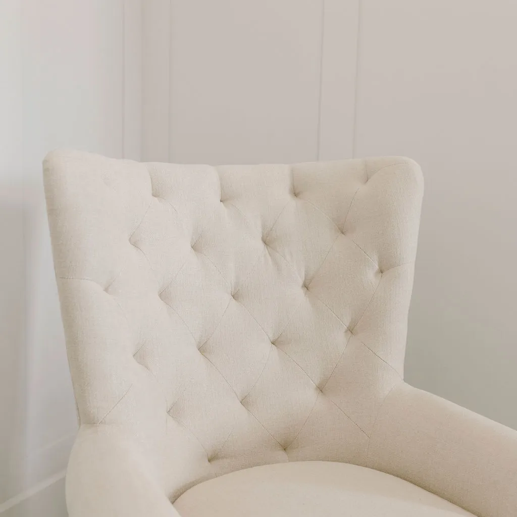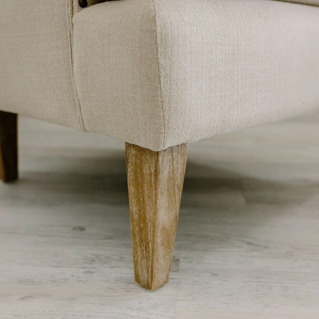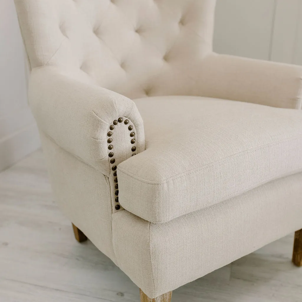 A tasteful and versatile chair, this linen look arm chair with curved back is as comfy as it is stylish! With deep pinched button detailing, metal studs and tapered distessed birch legs, it works in any scheme