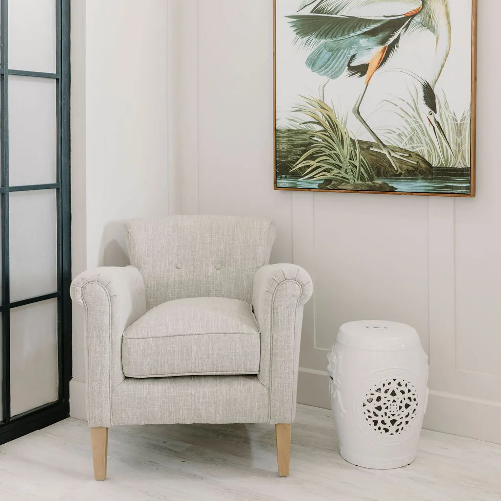 Our Clarissa chair is an absolute style favourite here at Stylish Home Secrets. It's classic lines, linen upholstery and birch legs offer soft natural textures in a neutral palette, making it the perfect chair for bedrooms, reading snugs or used in pairs to create symmetry in sitting rooms. In a classic biscuit shade, it's also the perfect backdrop for colour pops and accents added through cushions, rugs, lamps and throws. A timeless winner!