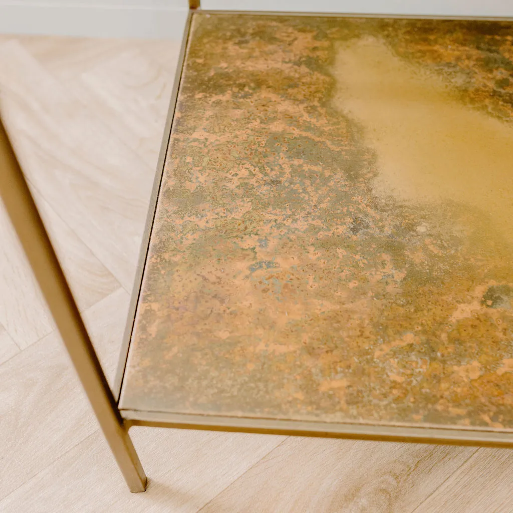 The practical second tier shelf also gives this piece a high end designer look. It has been oxidised to give a metallic decorative and unique patina