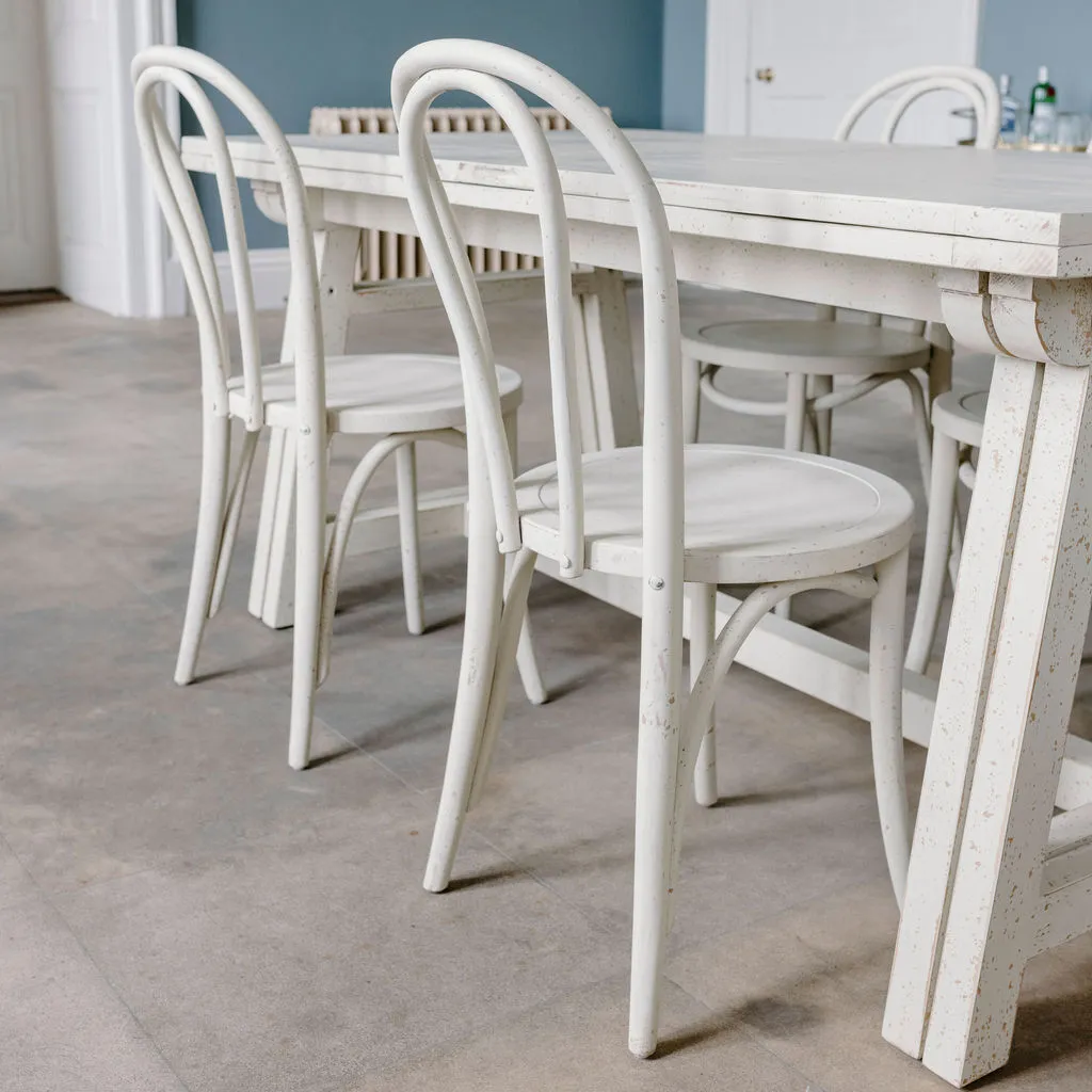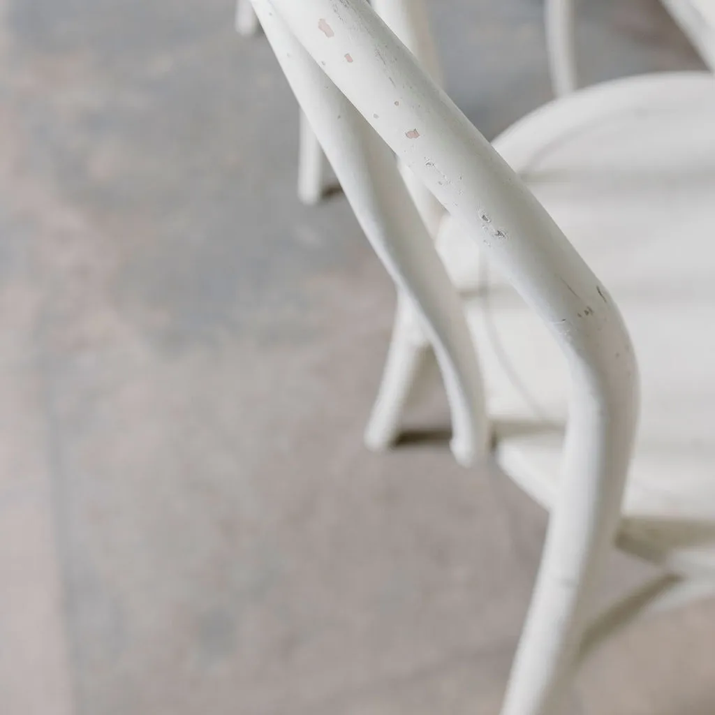 Beautiful and sturdily constructed chairs in the style of French Bistro chairs. With a heavily distressed paint finish, these beauties will give a gentle chic farmhouse or scandi look.
