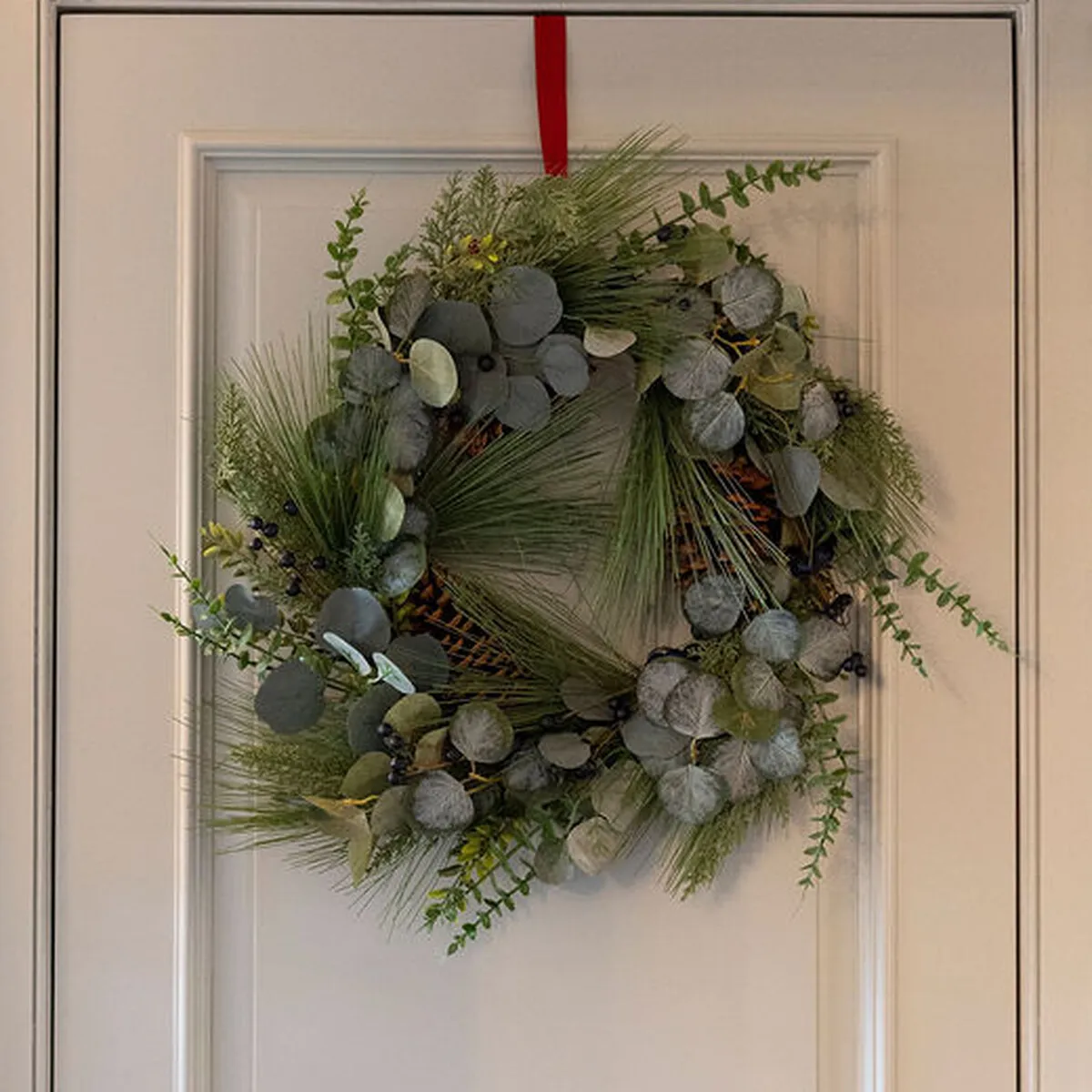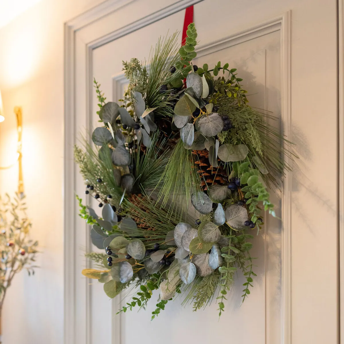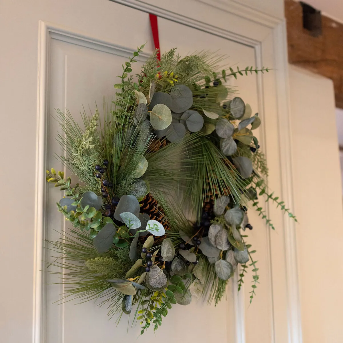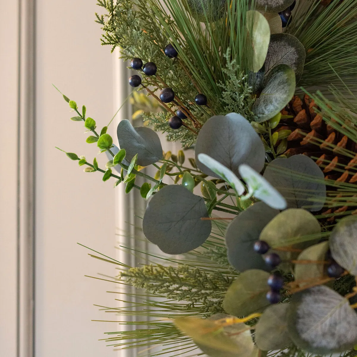 A stunning yet subtle wreath with pretty eucalyptus foliage enriched with pinecones for a polished finish.