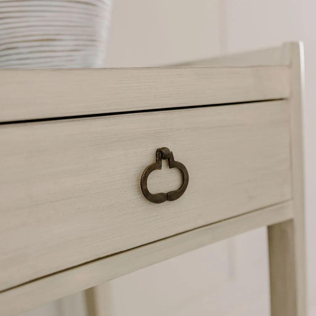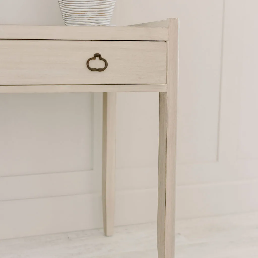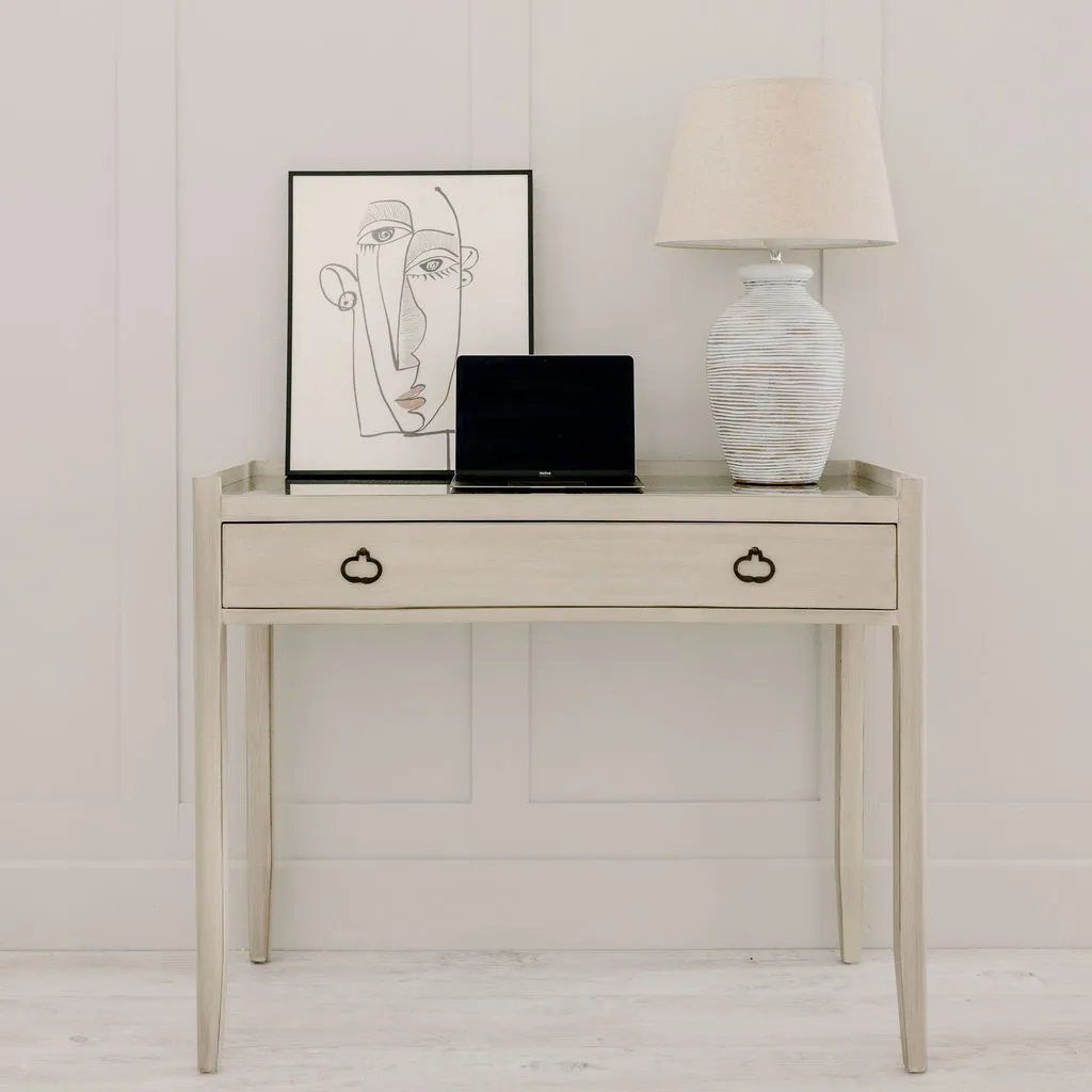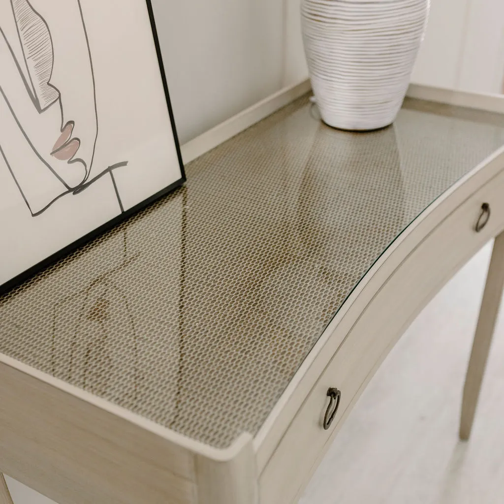 Inspired by scandinavian design and muted colour palette, this beautiful grey, curved desk features a rattan top overlaid by tempered glass, making it perfect as a desk or dressing table. Not only will the top stay ink or makeup free, but the full width drawer will keep it clutter free too!