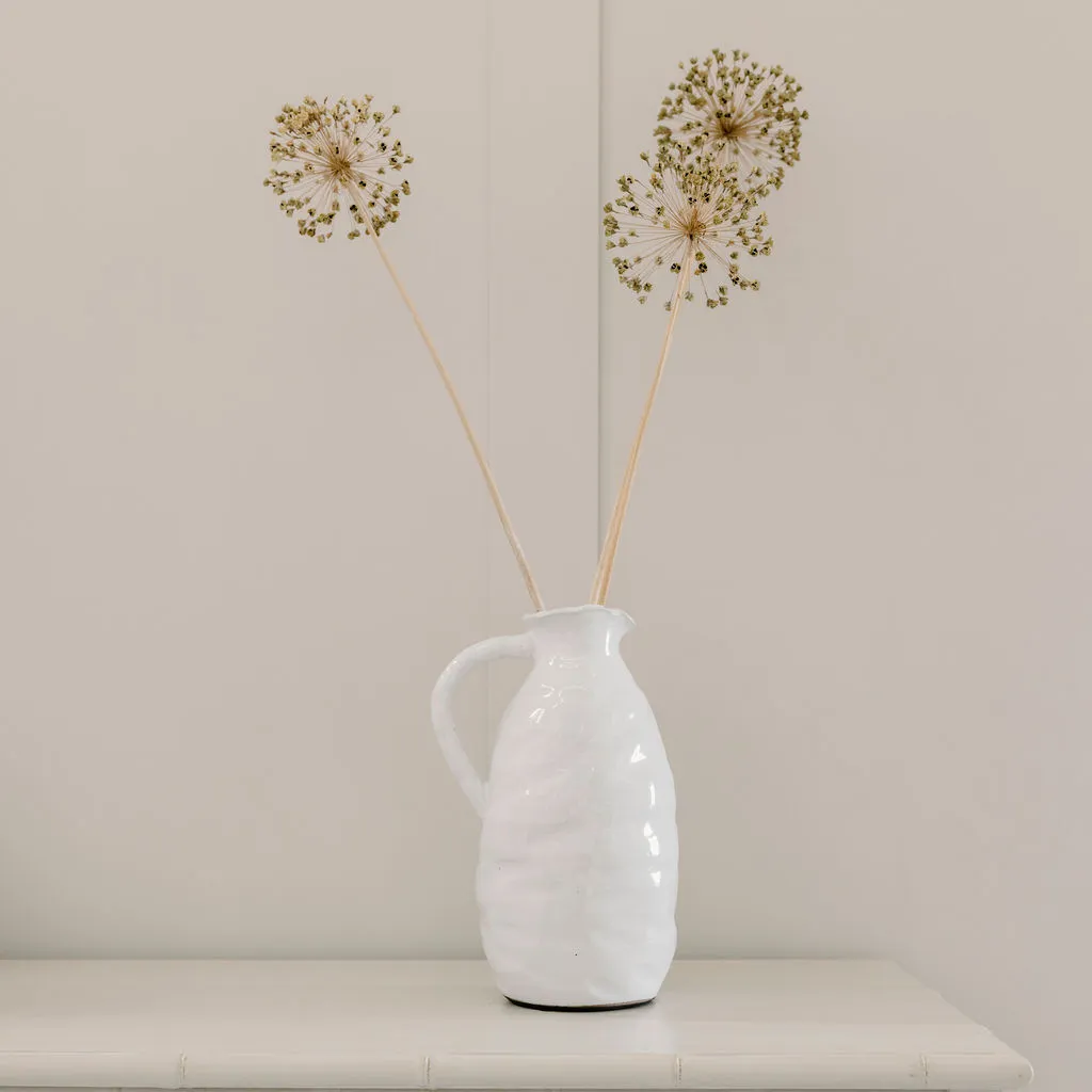 Each piece has been handmade to create a beautifully unique but useful jug. With its shiny white glaze and dimpled finish, it adds texture and organic form to any scheme. Perfect styled alone or with other white ceramics.
