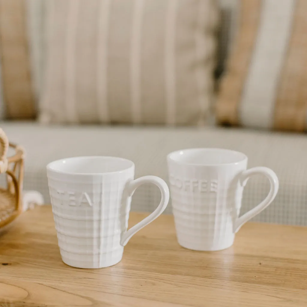 Genorously sized white glazed mugs with a textured pattern and the word tea in pale grey relief. Ideal neutral colour for any kitchen and you can bung them in the dishwasher - result!