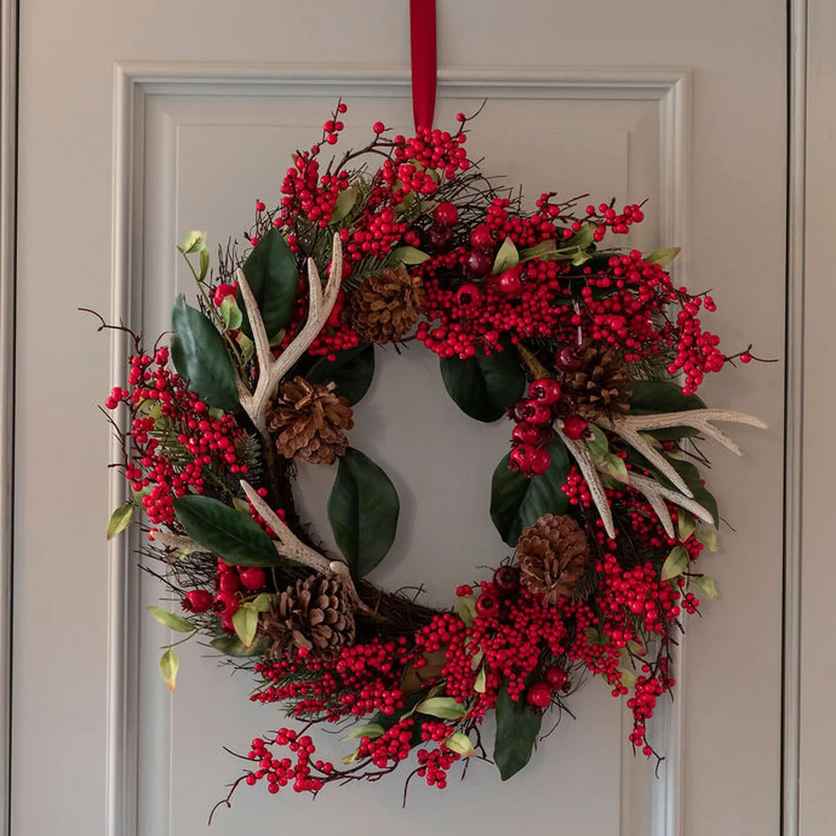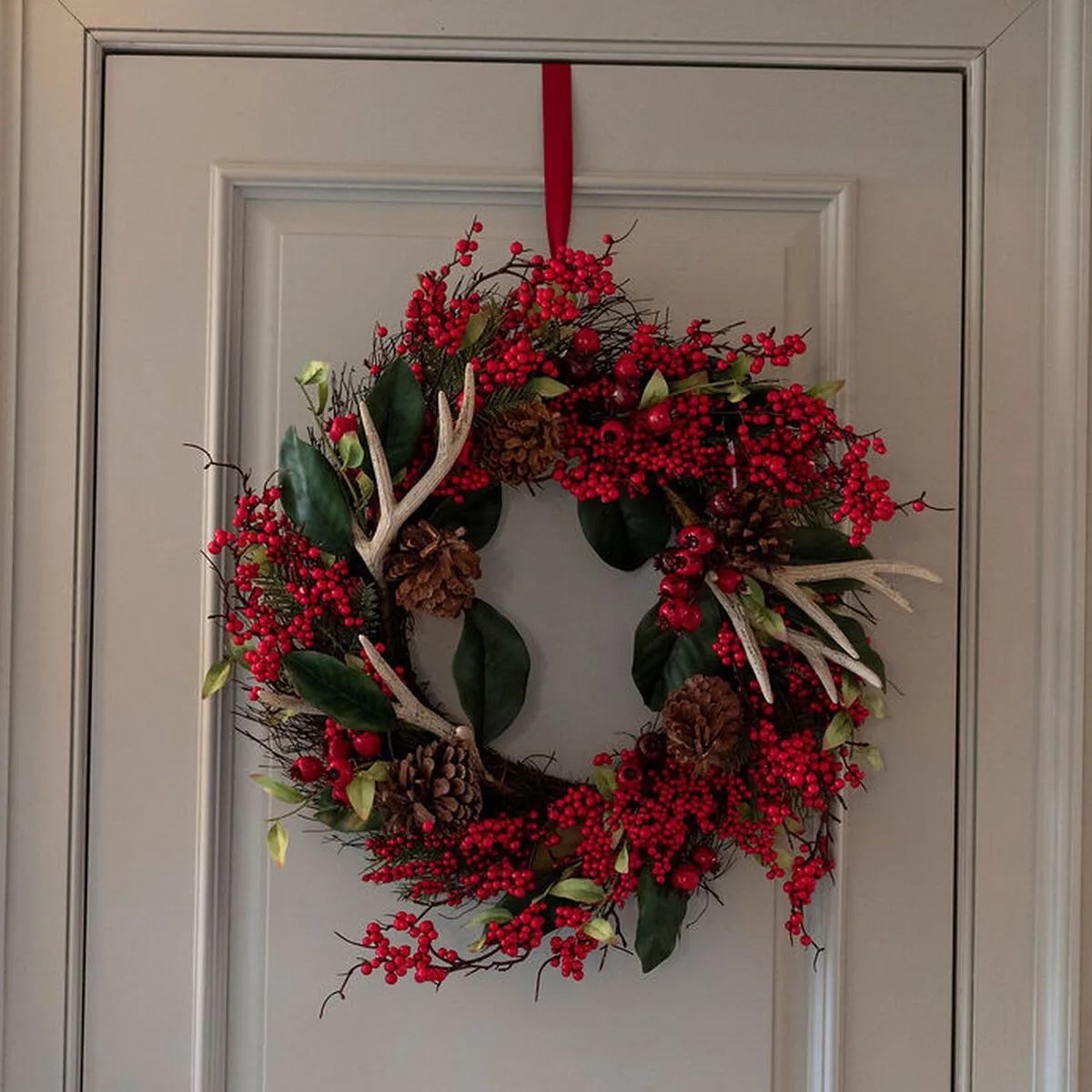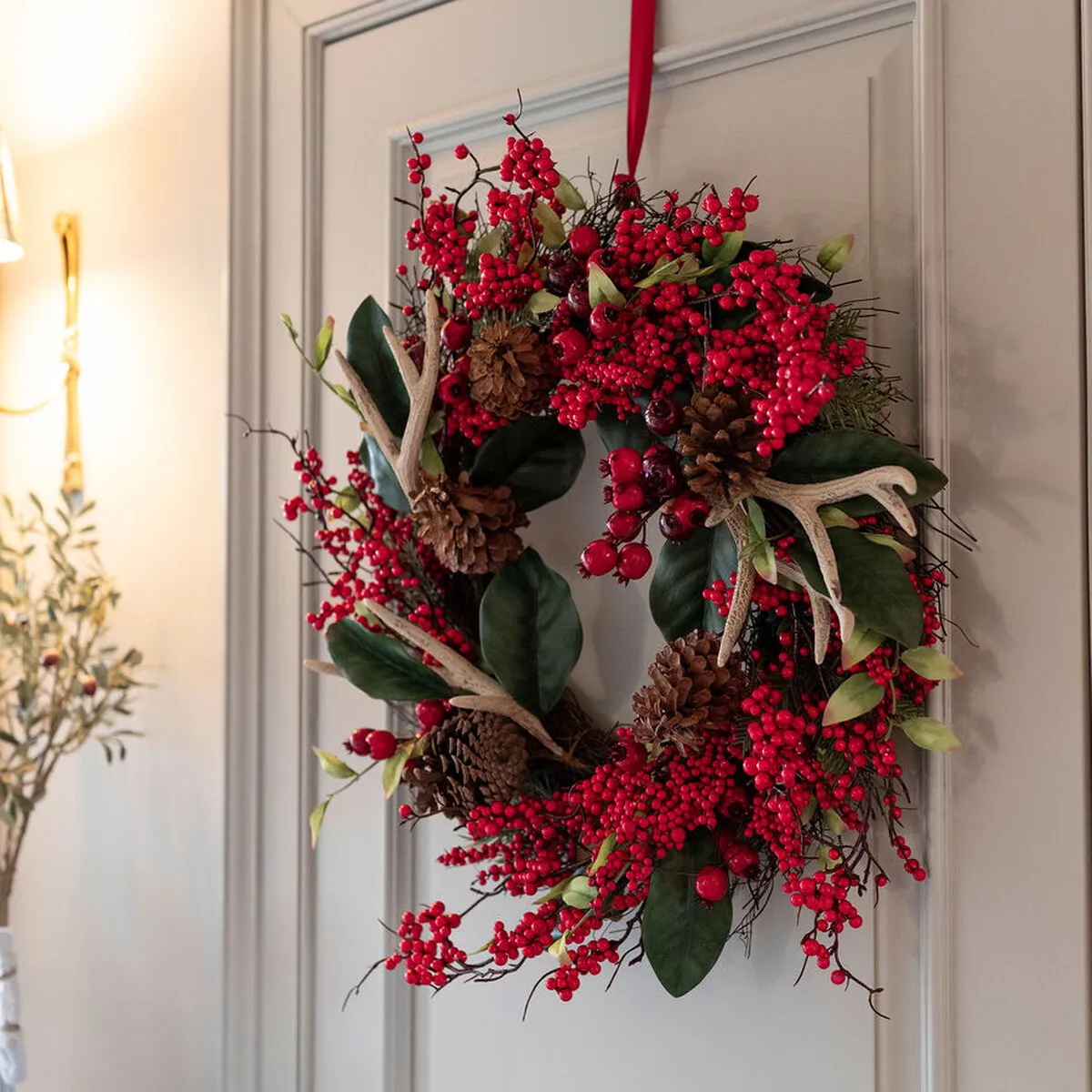 With its rich colours, berrries and faux antlers, this is a real statement wreath which will give you an instant cosy holiday aesthetic. Think roaring fires, layered candlelight, tartan and natural foliage. Ta da!