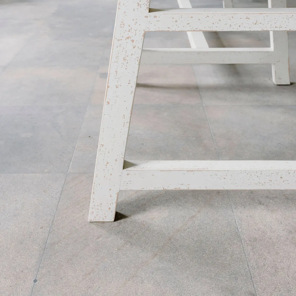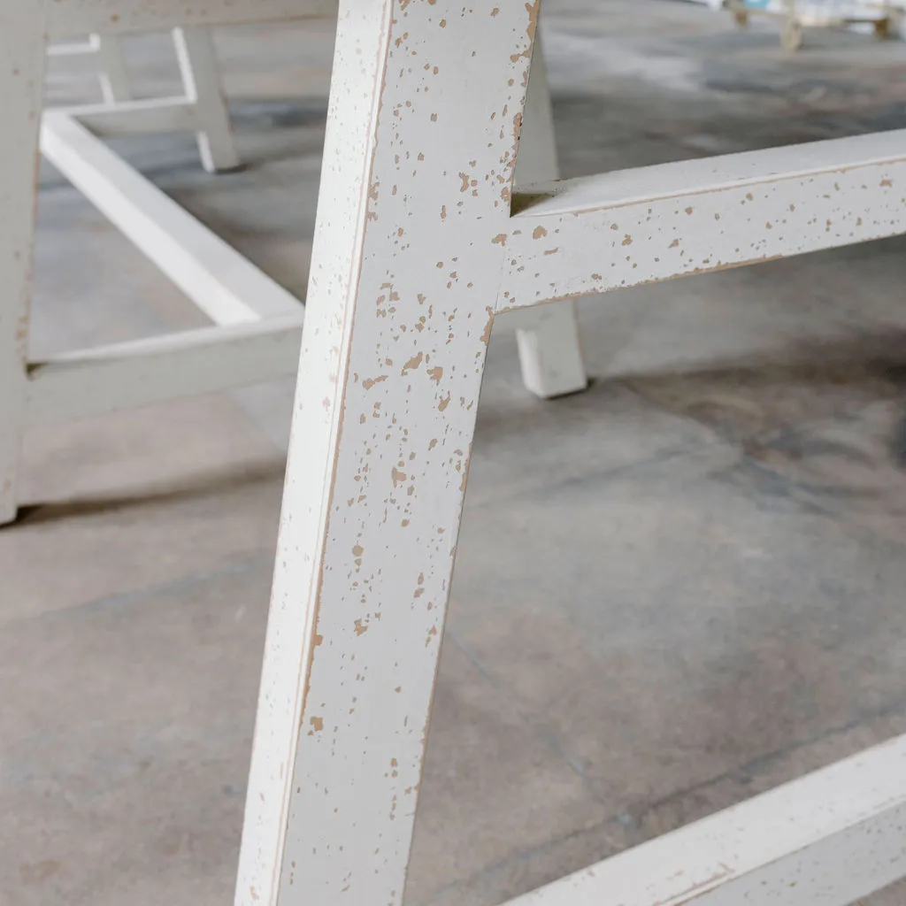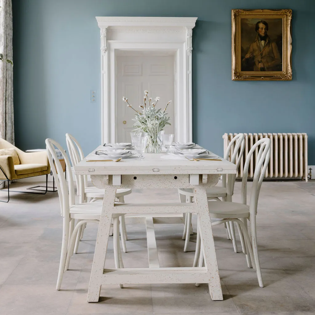 As ingenious and it's good looking, this distressed paint finished dining table, with trestle style legs, is perfect for day to day living but extends without fuss to accommodate 12-14 guests at over 3.4m long for Christmas and entertaining. A fantantasic looking table for farmhouse, Scandi or shabby chic vibes.