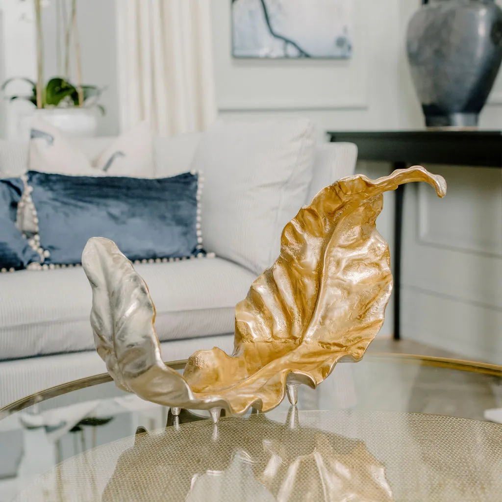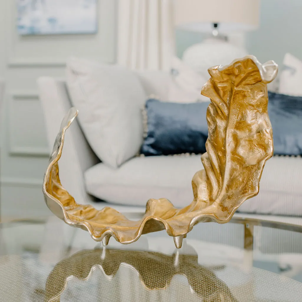 Create a designer look with this beautiful and incredibly stylish gold metal curled leaf sculpture. It comes on feet, so you can change the angle of the piece to suit your space. We love it styled on coffee tables and consoles and it's perfect against a simple white wall or modern art