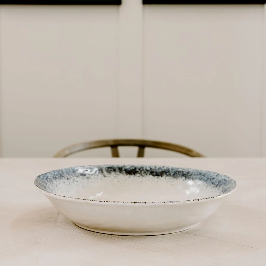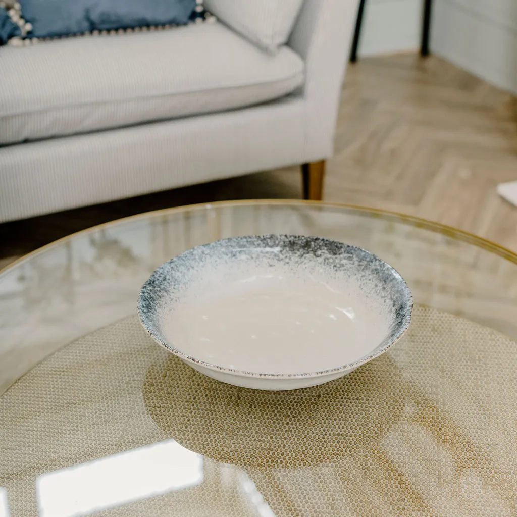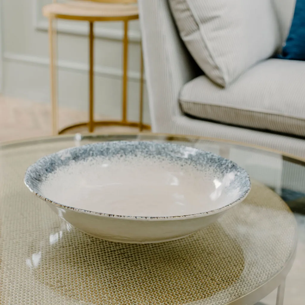 The appeal of this decorative bowl is the designer hand cast style with gorgeous speckled glaze effect movng from white to dark blue at the rim. Stunning styling piece for dining tables, kitchen islands, consoles, coffee tables and much more!