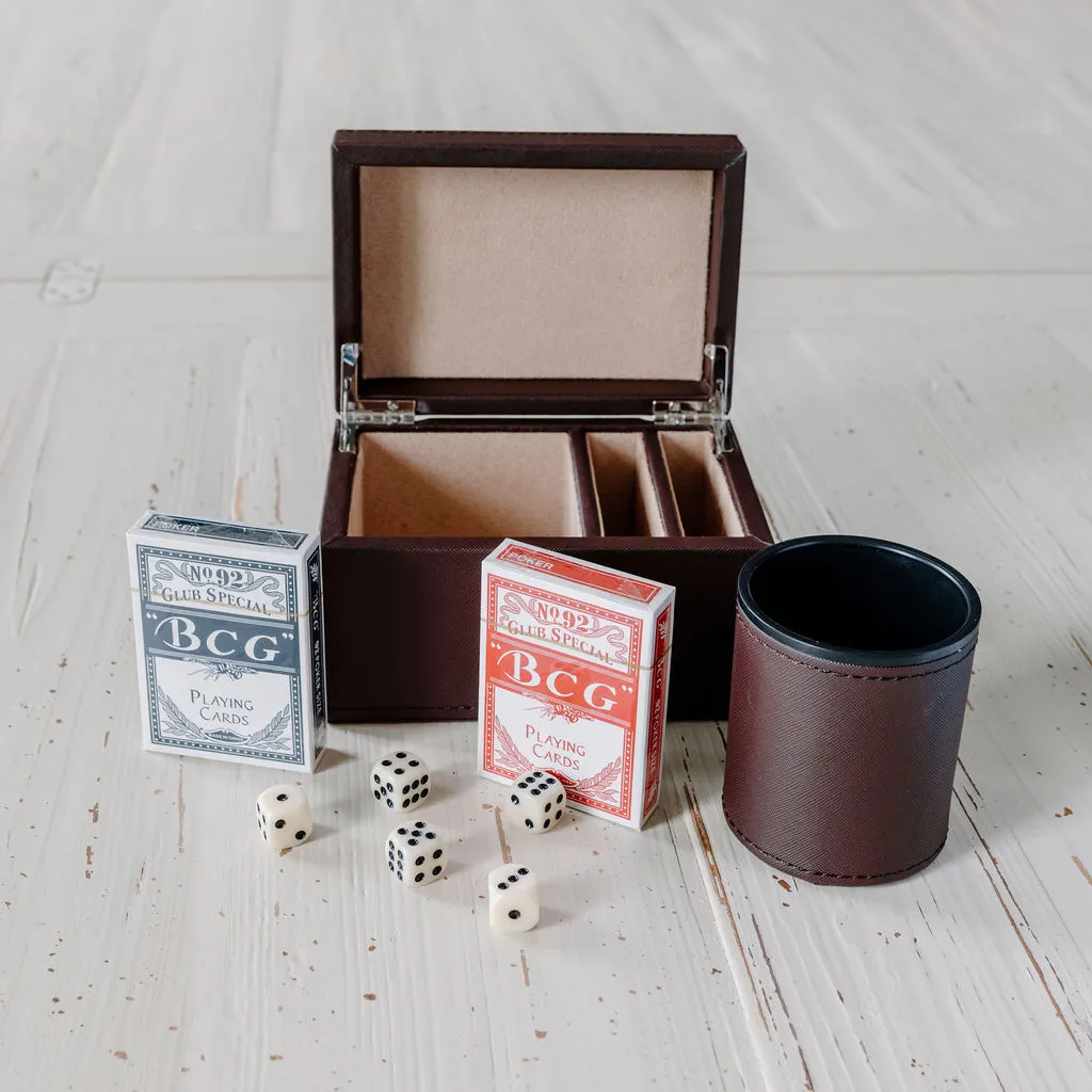 One of the most luxurious card and dice sets around. Lined with faux suede and with its own dice shaker, this set makes any card or dice game a pleasure to play and looks stylish on your coffee table, sideboard or console. No need to hide this beautiful set away - show it off with pride or gift it as the perfect pressie