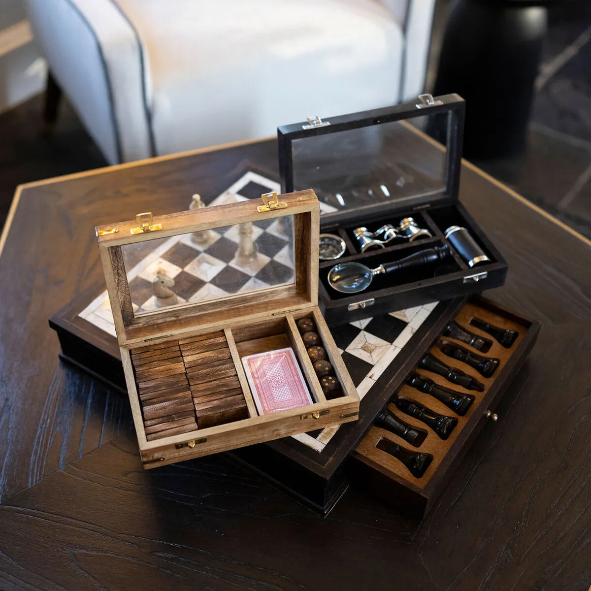 Glass topped to showcase the beautifully brass inlaid dominoes and dice sets