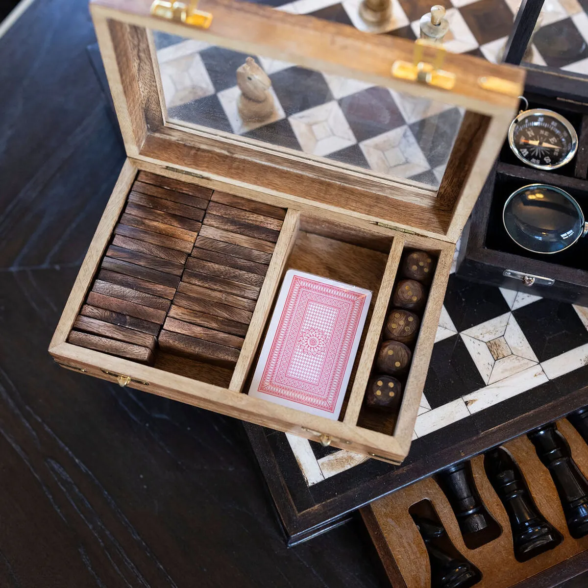 A gorgeous gift or addition to your home for games night! This beautifully handcrafted mango wood box containes a set of dominoes, 4 dice and a set of quality playing cards - so many games you can play! The dice, dominoes and box are inlaid with brass elevating this to an heirloom set and perfect gift