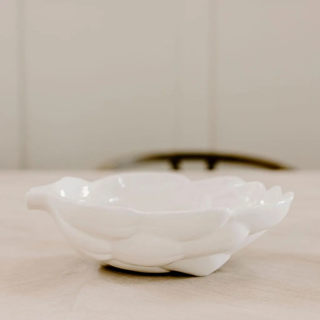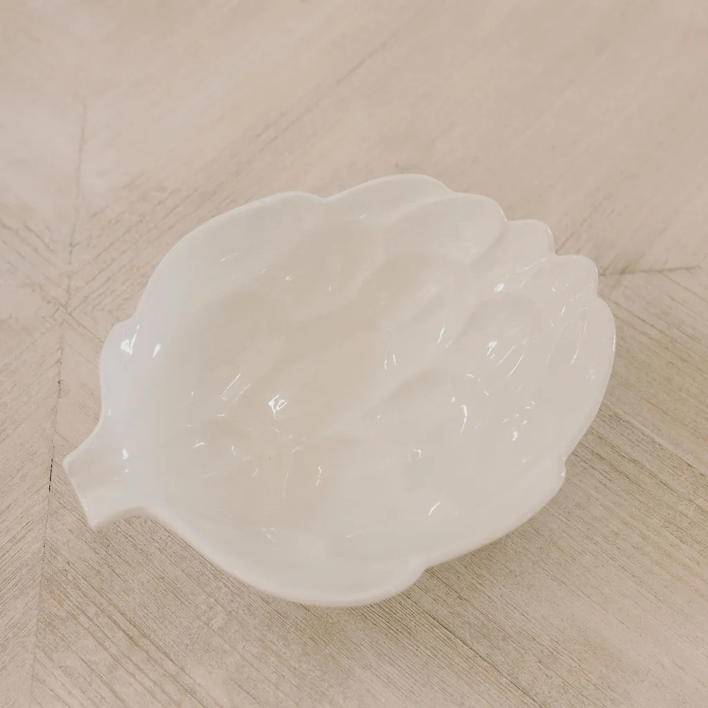 A beautifully detailed handmade bowl, which is as lovely as it is useful. It's food safe so this pretty white glaze will showcase your fruit or veggies perfectly. Or use it purely decoratively or for keys, coffee pods etc. At their core, artichokes have a very tender heart which is protected by strong outer layers – lending themselves to deep symbolism. They represent hope and prosperity - we love!
