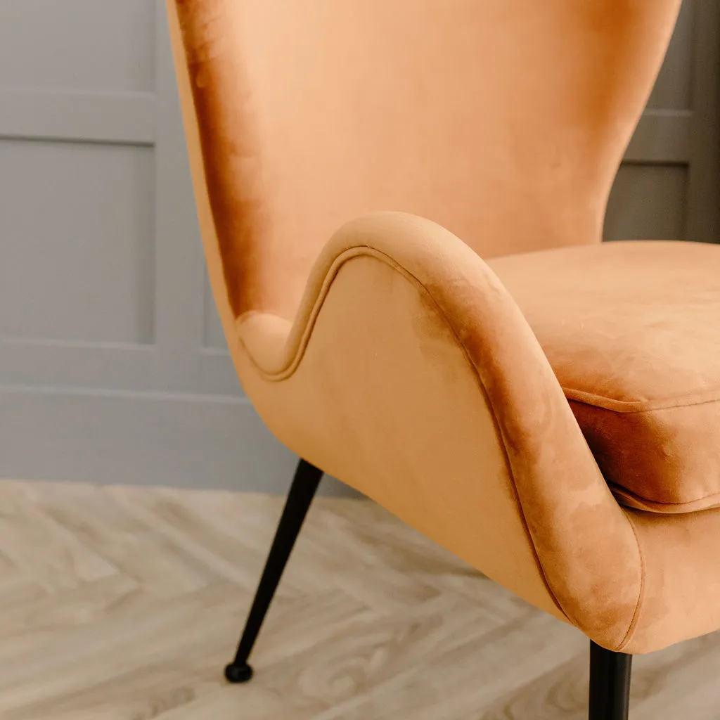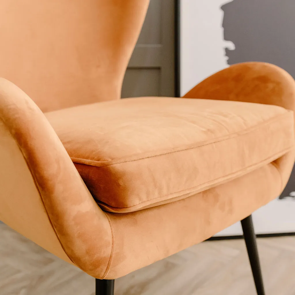 One of our most charismatic statement accent chairs with its sleek curved lines, classic shell shape and contemporary metal legs. A casual, modern take on a classic wingback style. Stunning.