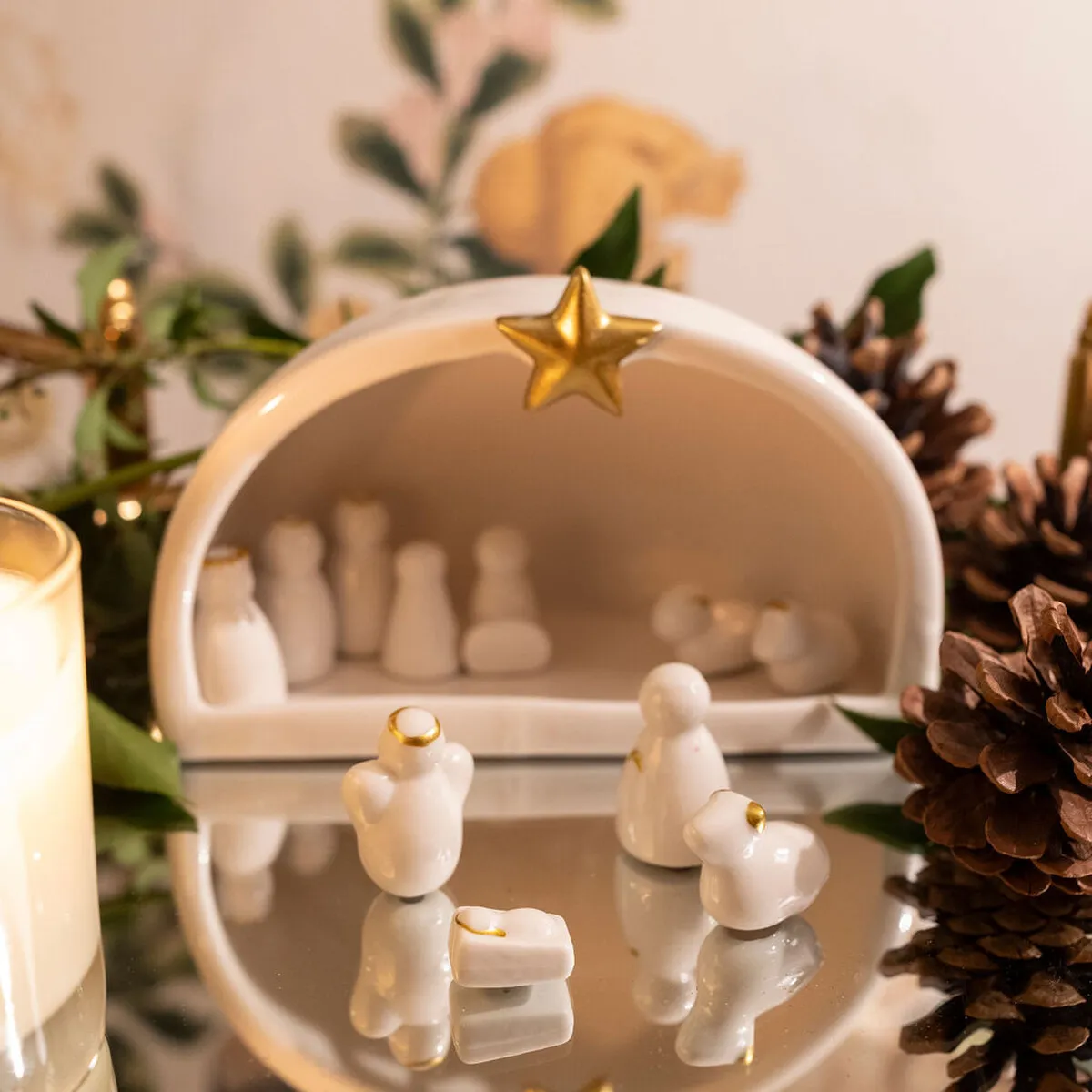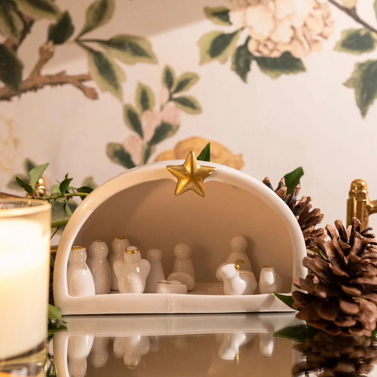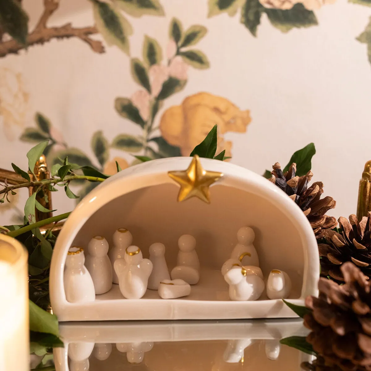 Topped with a gold star, this nativity set comes with it's own ceramic stable! Little hands can place the nativity characters wherever they want!