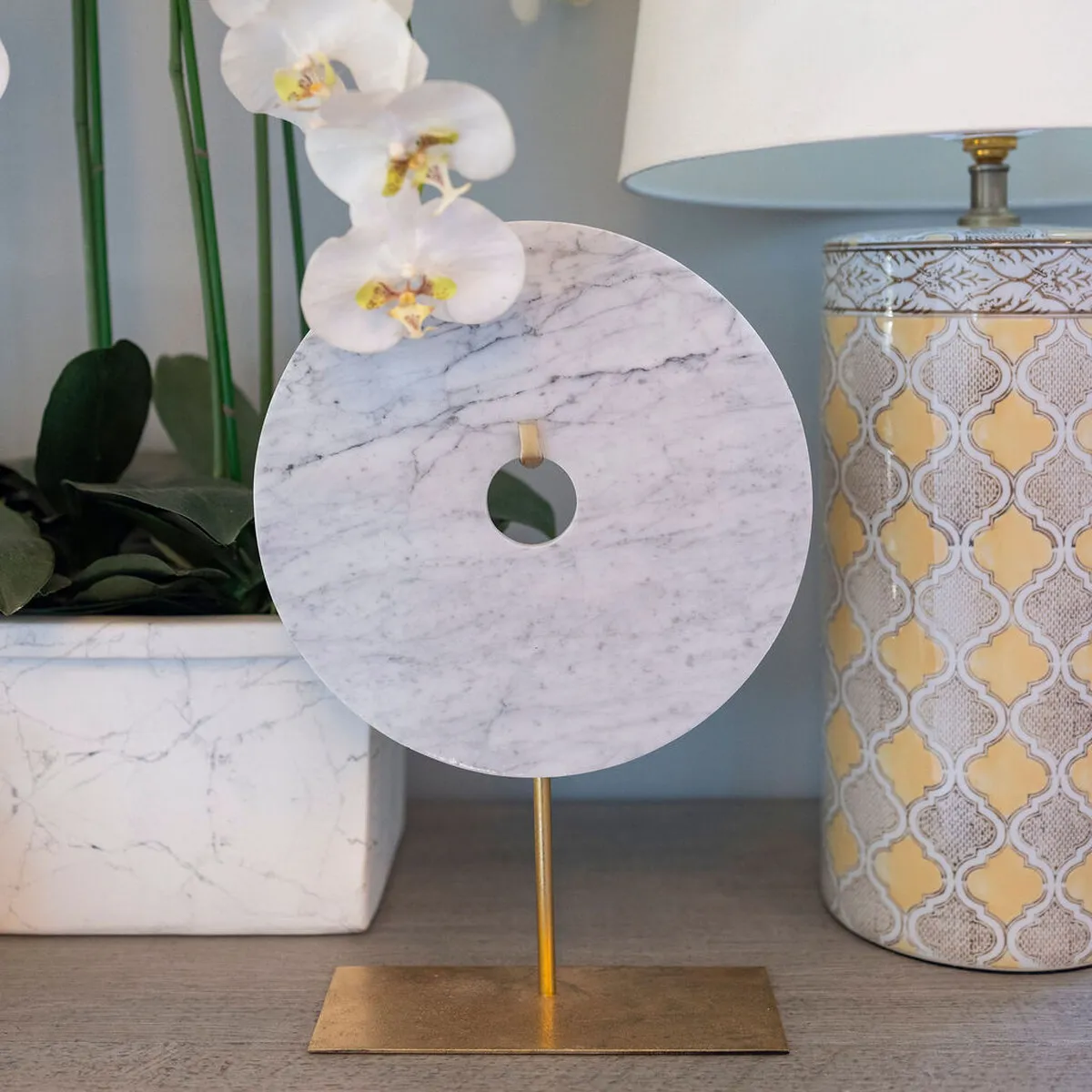 A stylish and tasteful styling piece inspired by ancient Neolithic Chinese bi discs- flat jade discs with circular holes in the centre. Bi discs are said to be a representation of heaven or the cosmetological concept of “a covering sky that revolves around a central axis. This gorgeous decorative version is made from beautiful Cararra polished marble