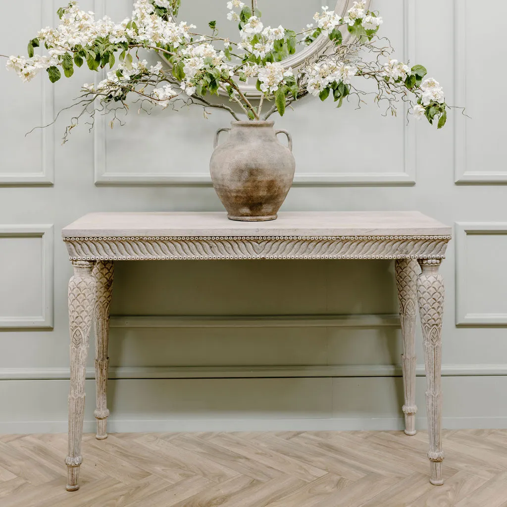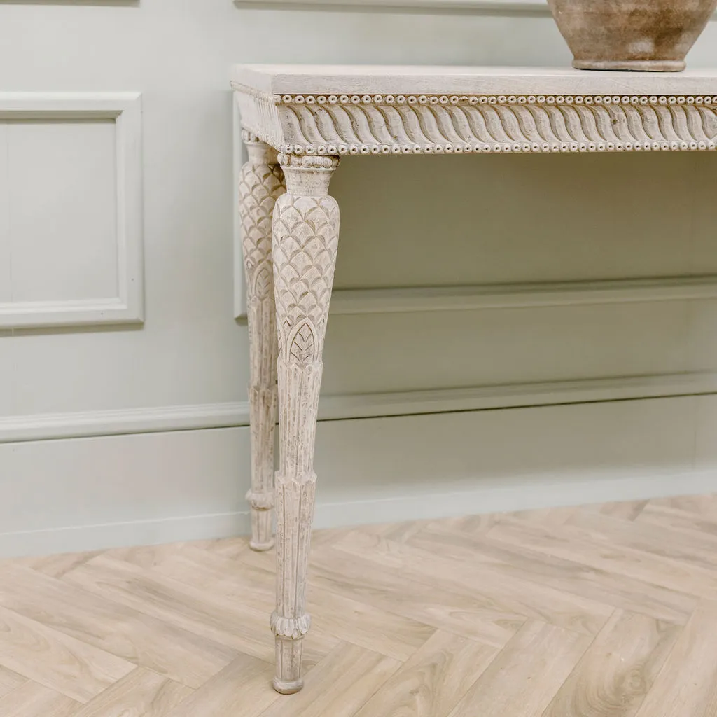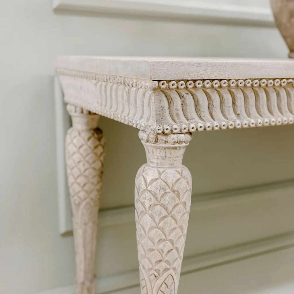 Exquisitely carved, this beautiful console table works well in any setting. With its fine detailing and intrciate patterns, it will bring an understated elegance to your home. Made from 100% distressed acacia wood, it will blend seamlessly into modern or more traditional schemes. As long lasting as it is beautiful, we think it's an heirloom piece for the future.