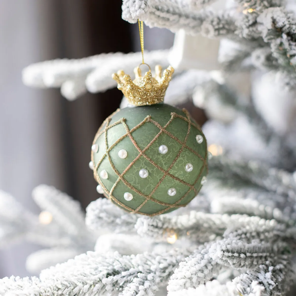 We adore the soft sage colour and the pretty pearl accents on this gorgeous glass bauble. Another bauble that pairs brilliantly with a tartan, heritage, luxe Christmas scheme.