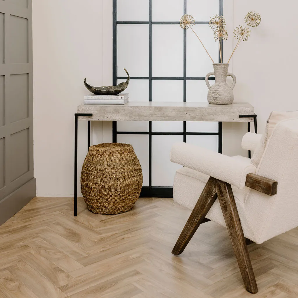 A fabulously stylish and cool looking faux concrete console table. This console with its minimalistic legs and polished faux concrete top will modernise any space with a clean, refined look. Perfect for styling with lamps, vases, antiques and aged urns