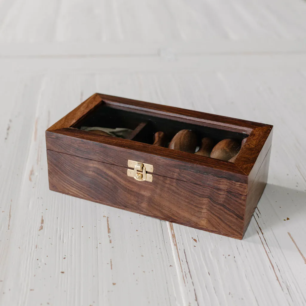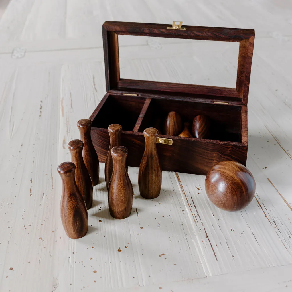 A delightful gift or addition to your interiors, this handcrafted Indian Rosewood box with brass catch and hinges, contains 10 skittles and a ball for endless hours of fun and games!