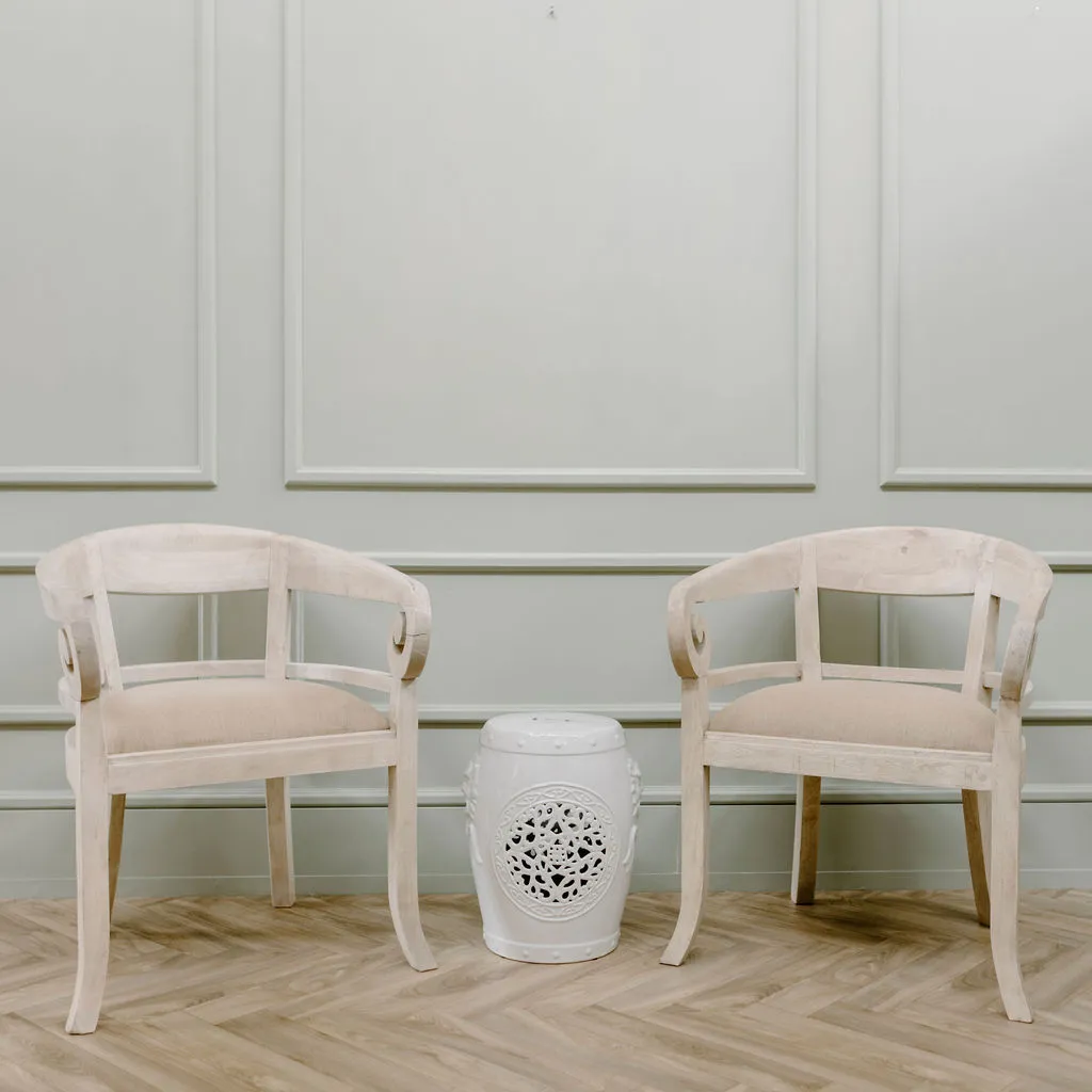 A fantatsic modern update of a classic 19th Century antique chair. Guaranteed to become a precious heirloom piece, this chair is the finest quality, featuring a Yoke-back and carved scroll low arms with oadded linen seat. We love it styled in pairswithin a sitting room or as a desk chair
