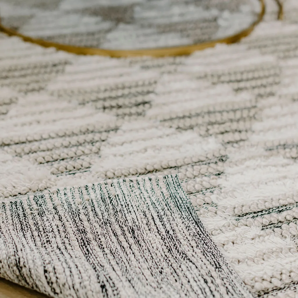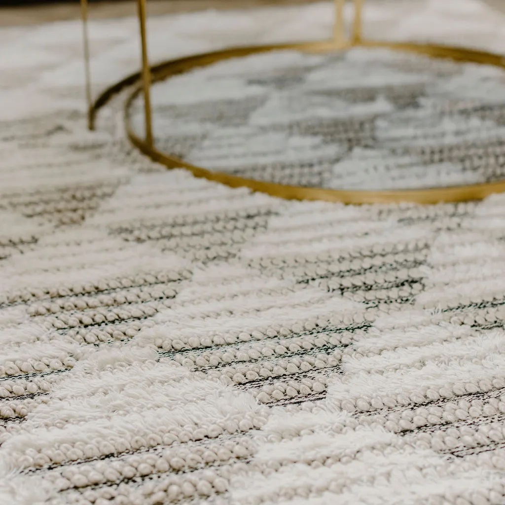 The mulit textured nature of this rug, togther with the mid century modern geometric pattern makes it a truly stand out rug. We love everything about it and with its natural tones, its perfect for any home and any room!